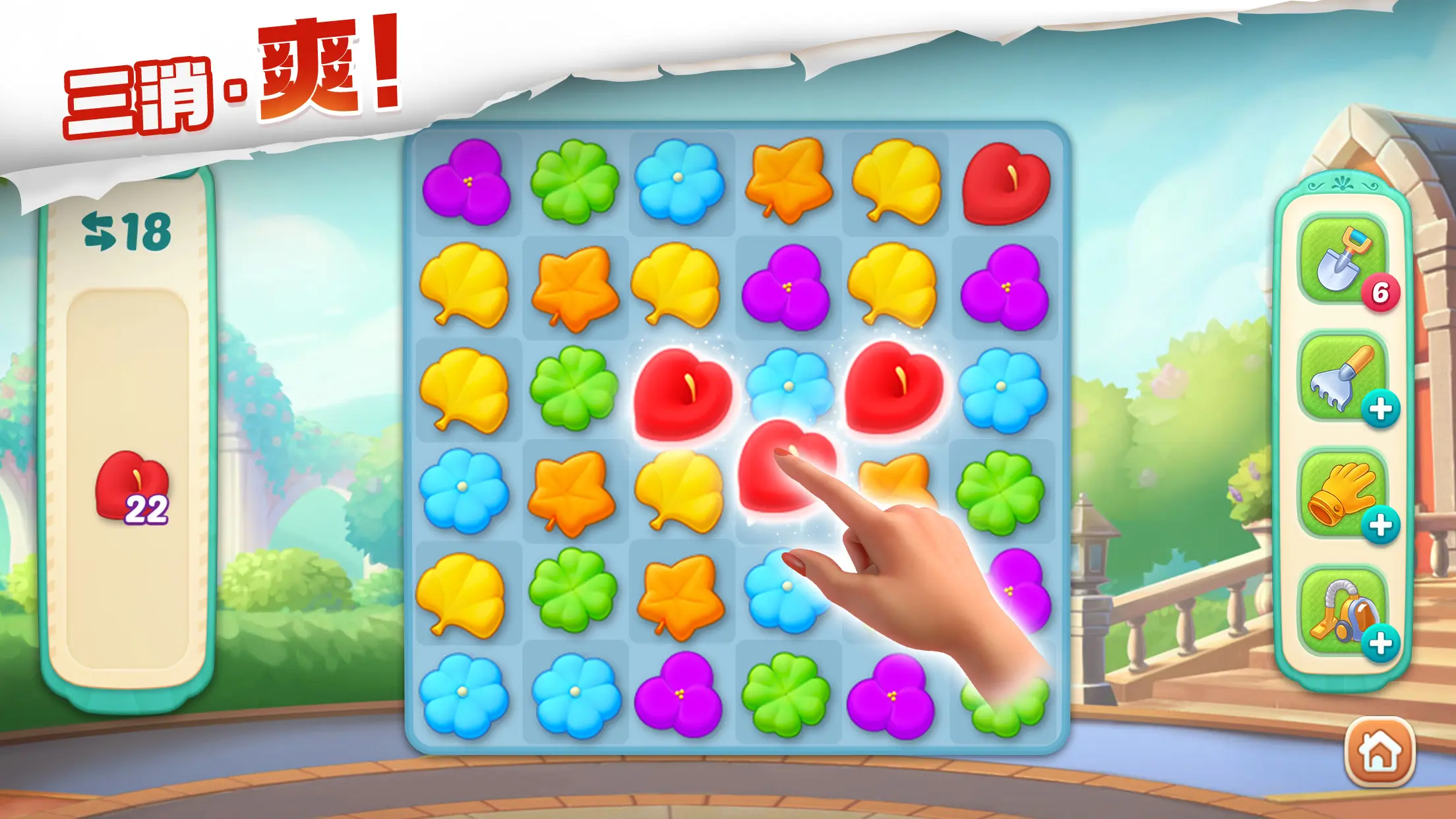 游戏的核心玩法是传统的三消模式,玩家需要通过消除相同的花朵来收集资源。消除的花朵数量越多,获得的资源也就越丰富。