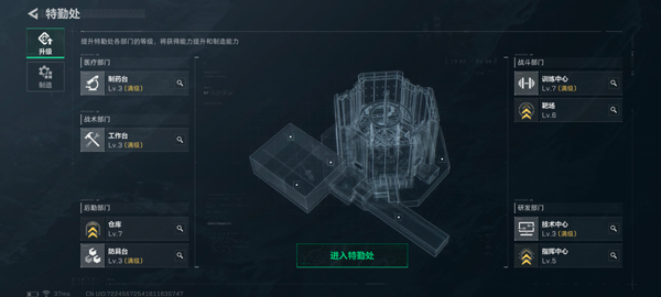 2、进入特勤处后,选择升级,找到训练中心;