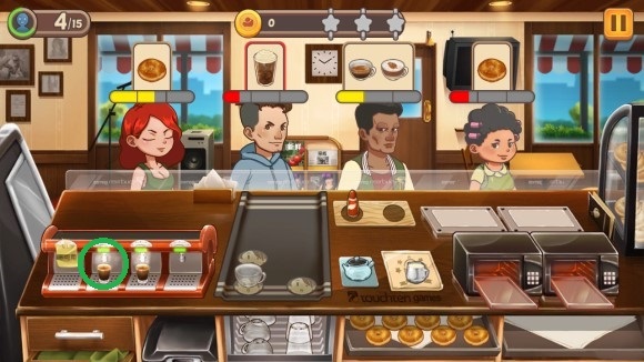所有咖啡的制作都离不开最基础的浓缩咖啡。所以你需要点击开启浓缩咖啡机,先制作一杯浓缩咖啡。红灯亮了就证明咖啡机已经在运作中。值得一提的是,这里需要等待片刻。当你发现你制作咖啡的速度已经追不上前来光临的客人速度时,你就要好好考虑要升级设备啦。