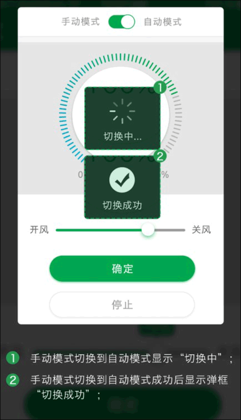 手动模式下,滑动屏幕下方的进度条,选择要调节的风口大小,然后点击确定按钮进行调节,点击停止按钮停止调节,如下图。