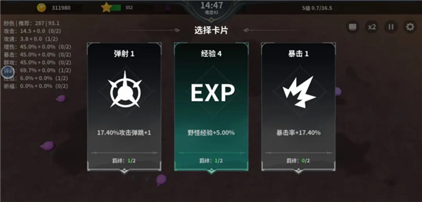 4、每次击败后英雄就会升级,并会随机获得3张1-9级的卡片,同时也会获得一些集星进度,选择一张卡片继续游戏;