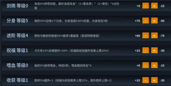 前期加点顺序是分身1级、进阶1级、属性点、祝福1级、收获1级、剑雨1级,之后再分身、进阶、属性点不断循环。属性点加多少看你自己喜欢,剑雨看你感觉去加。