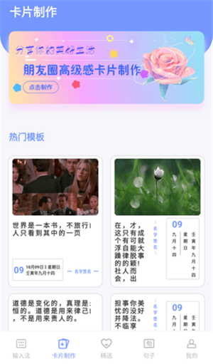 打造您的高级朋友圈。APP里提供朋友圈配图、朋友圈文案,您也可以选择自己的图片或自己编辑文案,添加上图片边框、签名,一张高级的朋友圈卡片制作即刻完成。您可一键保存或分享至朋友圈。