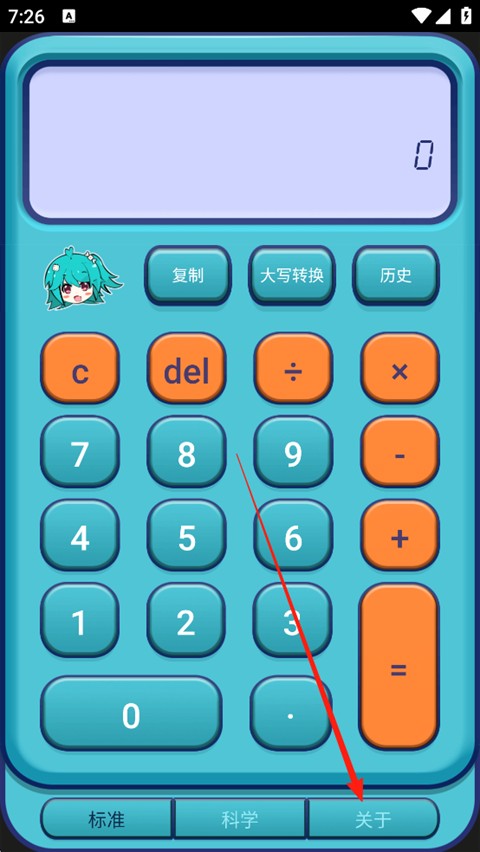 1、图一是二次元计算器的标准计算界面,蓝色基调搭配卡通头像,有数字和运算按键,还设有复制、大写转换等功能按钮。