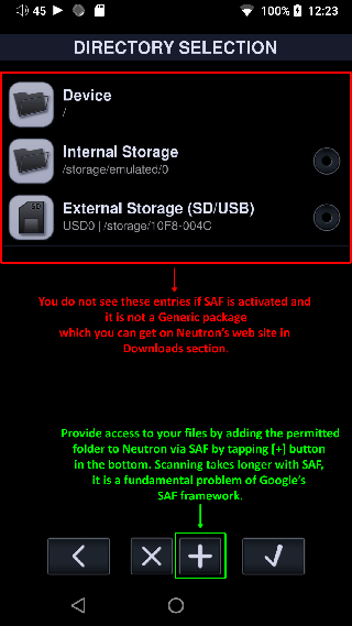 1、从 Sources 部分删除现有的源条目,并使用 Google 的新 Scoped File Access (SAF) API 创建新的源条目,这是访问应用程序用户文件的唯一可能性。为此,您需要: Sources -> [+] -> File System -> [+] -> 在操作系统选择对话框中选择音乐文件夹 -> 一旦您确认,此文件夹将被添加到 Neutron 的文件系统列表中。之后,您可以点击此条目浏览并选择要扫描的文件夹,也可以直接选择允许的文件夹并确认扫描。请记住,SAF 比通用文件访问慢 10 倍,这是由于 Google 的糟糕实施造成的。