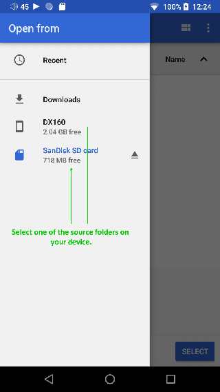 3、操作系统将显示允许选择文件夹并授予 Neutron 访问权限的对话框,您可以通过进入文件夹并按下底部的选择按钮来选择内部存储或 SD。