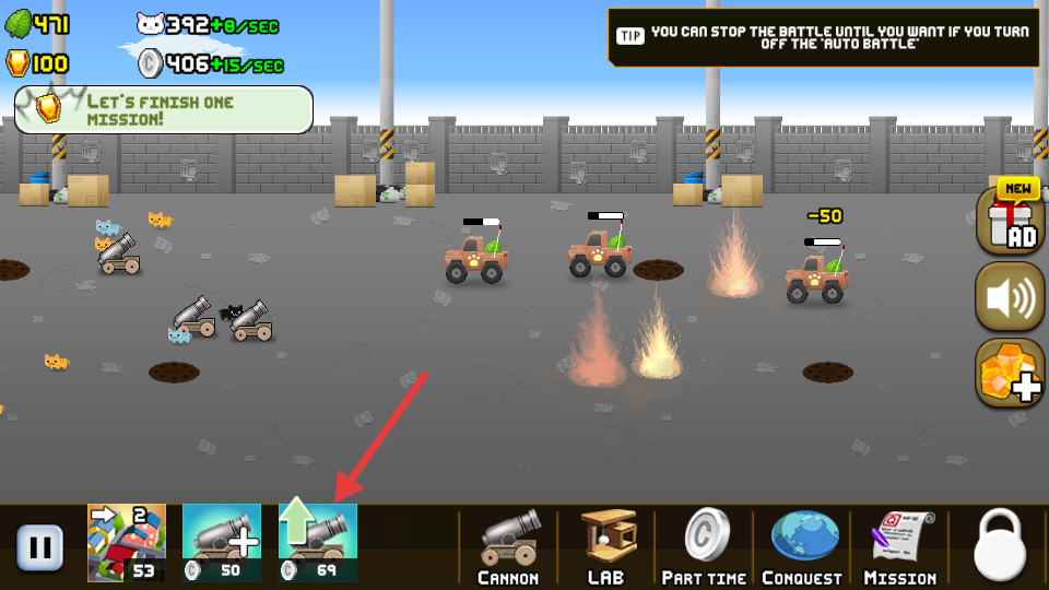2、点击左下角的图标对加农炮威力进行提升。