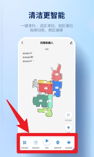 2、进入主界面后,底部功能栏可选择“划区清扫”“选区清扫”“开始”等清洁控制功能,操作直观方便。