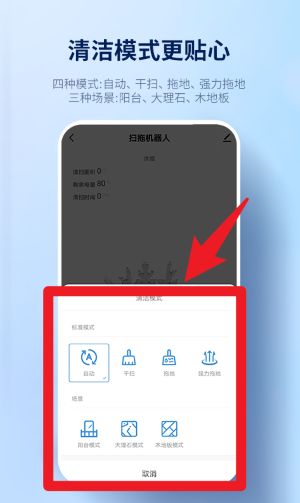3、点击清洁模式设置区域,可选择自动、干扫、拖地、强力拖地等不同清洁模式,满足多种地面需求。