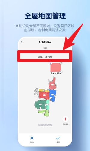 4、地图管理中点击“区域”或“虚拟墙”按钮,可以进行清扫区域设置与禁扫区规划,提升使用的灵活性。