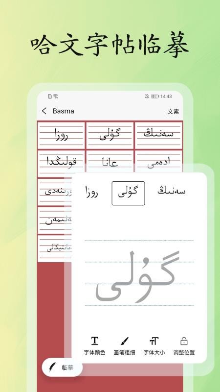 维哈书法练字大师是一款专业的维吾尔语言文字练习软件,软件给用户提供丰富的素材,在线就可以练习,并且软件还有非常多的字帖可以使用,通过临摹的方式进行书法训练,用户在线就能找到对应的文字,设计的所有书法字帖都可以支持导出以及下载,在线就能得到所有的文素内容,还能生成定制化的字帖,软件给用户提供专业的练字工具,让写字练字更加的灵活,在线就能提升自己的书法能力,在字体库中挑选想要的字体内容,还能设置同款字帖。
