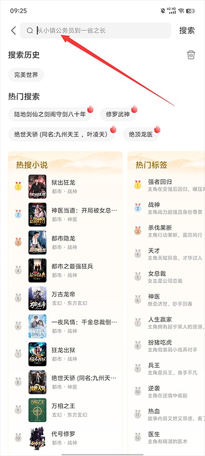 2、在搜索栏内输入想要看的小说;