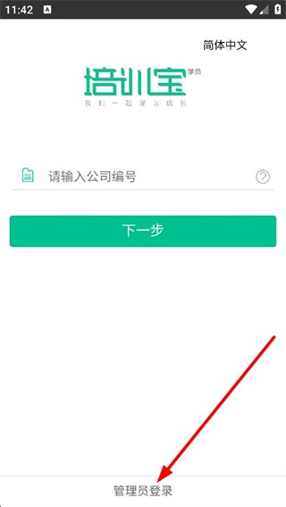 1、进入界面先看到简体中文标识和培训宝字样,下方有请输入公司编号的输入框,还有下一步按钮,底部可选择管理员登录。