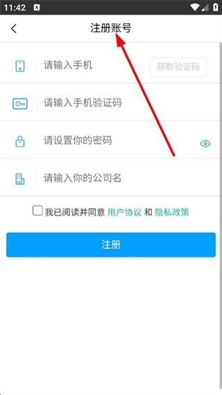 3、进入注册账号界面,需依次输入手机获取验证码,再设置密码、输入公司名,勾选协议后,点击注册按钮完成账号注册流程。