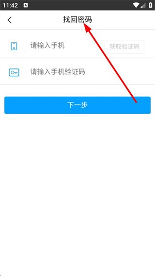 4、进入找回密码界面,先输入手机获取验证码,再填写手机验证码,之后点击下一步按钮,即可继续完成密码找回的后续操作。