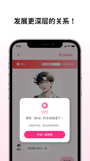 4、好感度系统:通过与虚拟角色的互动,用户可以提升角色的好感度,解锁从“熟人”到“恋人”甚至“结婚”的不同阶段。随着好感度增加,可开启新的关系阶段,带来真实恋爱般的体验。
