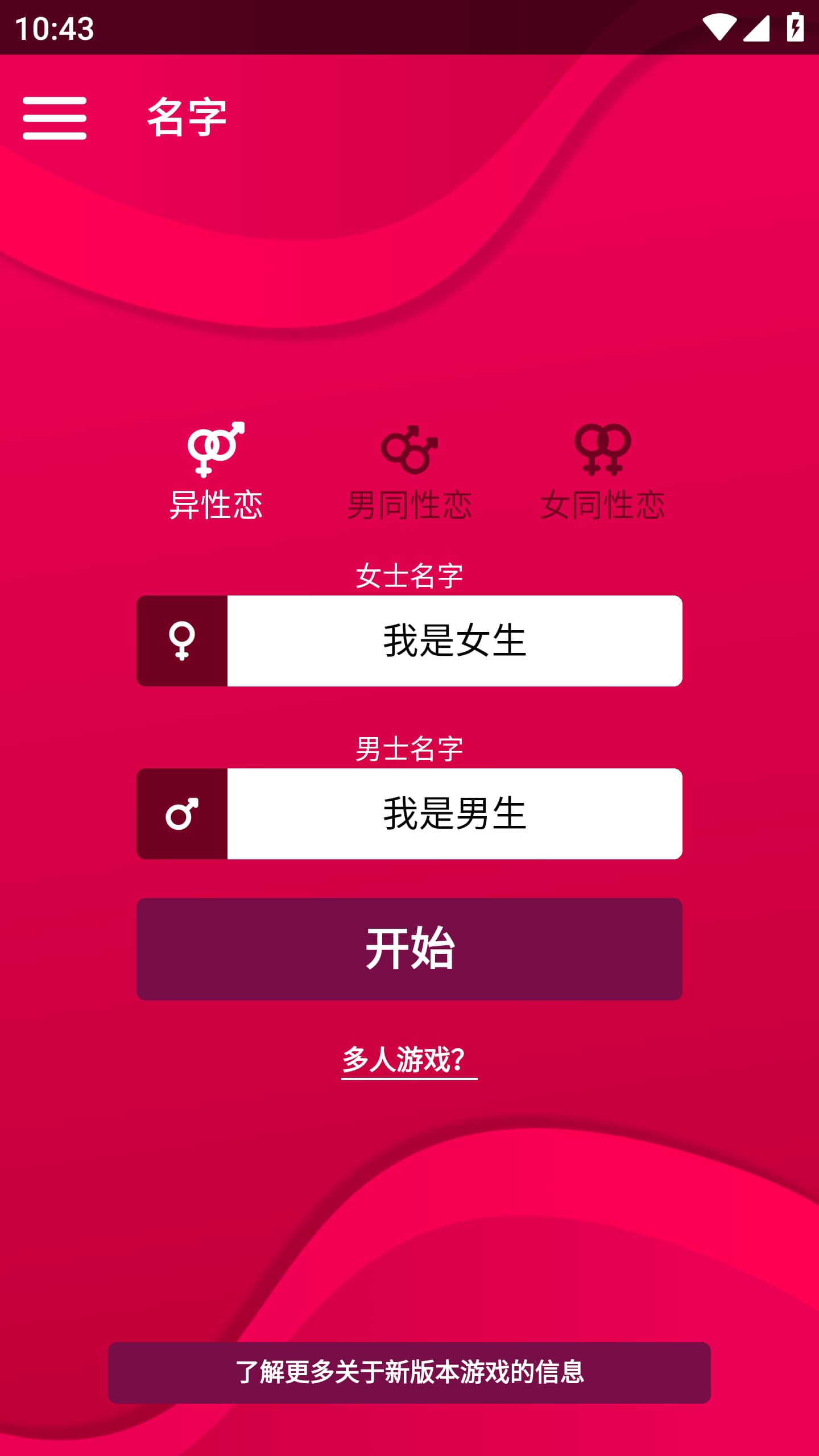 1、用户在本站下载安装Couple Game游戏,进入后输入男士和女士的名字,点击"开始"。