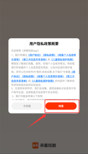 1、启动来看短剧应用,先在隐私政策页面点击同意按钮进入程序。