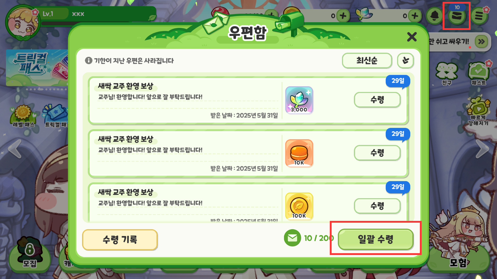主页面,右上角点击邮件并一键领取所有