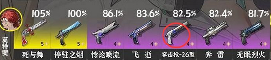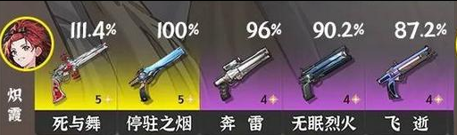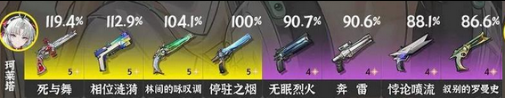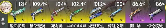 2、武器右上方百分比数字为角色携带该武器个人伤害体现,以1阶常驻五星武器为100%基准。武器按照优先级排序。